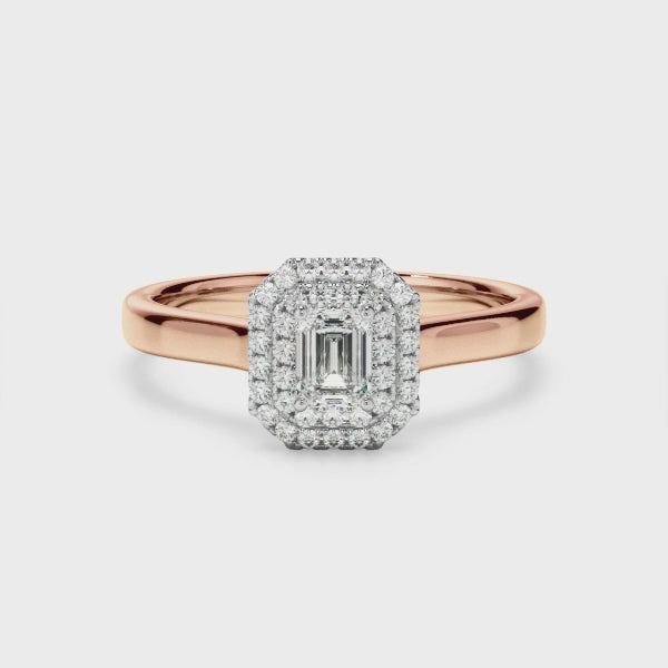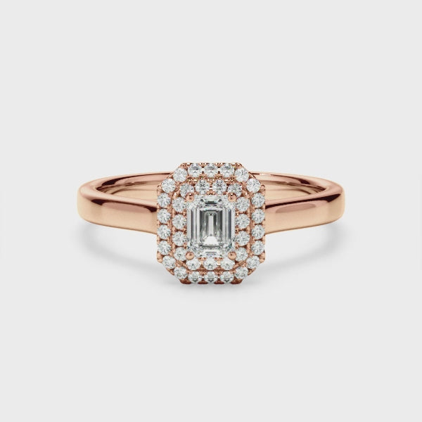 Set in 18ct Rose Gold with your choice of Gold or Platinum Setting. "Magnolia" is a timeless double halo design set with an elegant 0.30ct EVS2 Emerald Cut LAB grown Bloom Diamond. Total Diamond Weight 0.50ct.