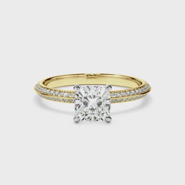 Cushion Cut Diamond Knife Edge Engagement Ring With Diamond Pave Sides
