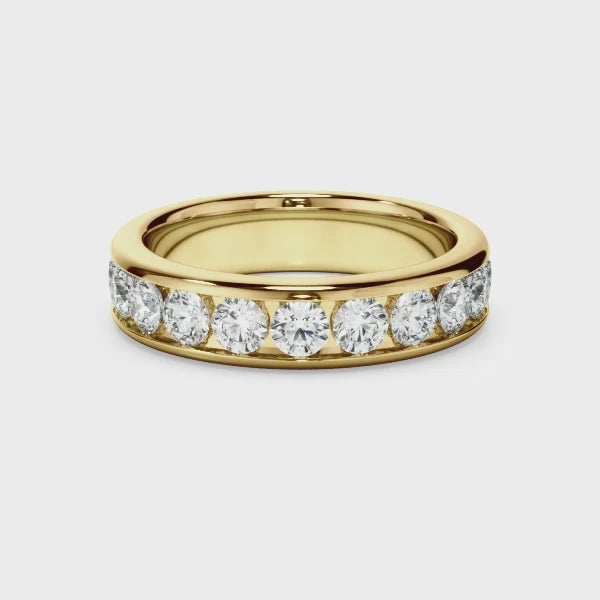 This stunning custom-made wedding ring features a half band of round brilliant cut diamonds set on an 18ct gold or platinum band. Exuding fluidity in its line work, and boasting an elegant silhouette, as with all the pieces in our Bespoke Collection, this piece is made especially for you.