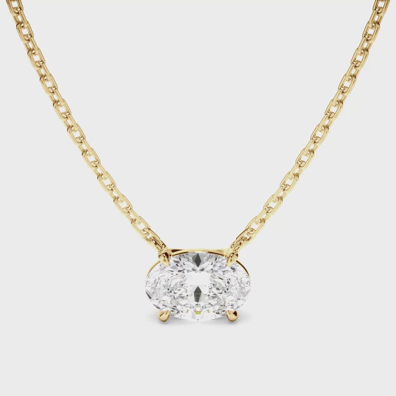 This elegant oval cut diamond necklet, made with your choice of diamond centre stone, features an East West setting and includes a 45cm 18ct gold chain. Exuding fluidity in its line work, and boasting an elegant silhouette, as with all the pieces in our Bespoke Collection, this piece is made especially for you. Pictured here with a 1.50ct Oval Cut Diamond, a final price is determined following your centre stone selection.