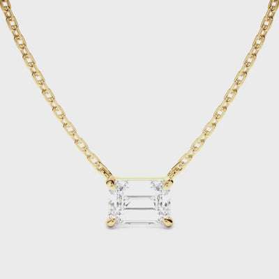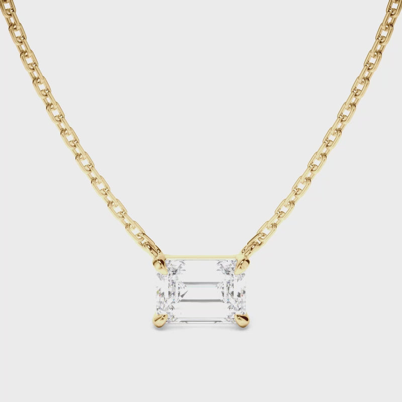 This elegant emerald cut diamond necklet is made with your choice of diamond centre stone, features an East West setting and includes a 45cm 18ct gold chain. Exuding fluidity in its line work, and boasting an elegant silhouette, as with all the pieces in our Bespoke Collection, this piece is made especially for you. Pictured here with a 1.50ct Emerald Cut Diamond, a final price is determined following your centre stone selection.