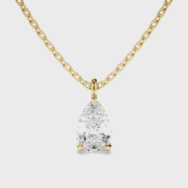 This elegant pear cut diamond pendant is made with your choice of diamond centre stone, and includes a 45cm 18ct gold chain. Exuding fluidity in its line work, and boasting an elegant silhouette, as with all the pieces in our Bespoke Collection, this piece is made especially for you. Pictured here with a 1.00ct Pear Cut Diamond, a final price is determined following your centre stone selection.