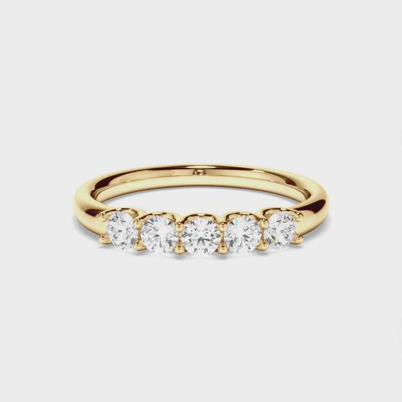 This stunning custom-made anniversary ring features five round brilliant cut diamonds set on an 18ct gold or platinum band. Exuding fluidity in its line work, and boasting an elegant silhouette, as with all the pieces in our Bespoke Collection, this piece is made especially for you.