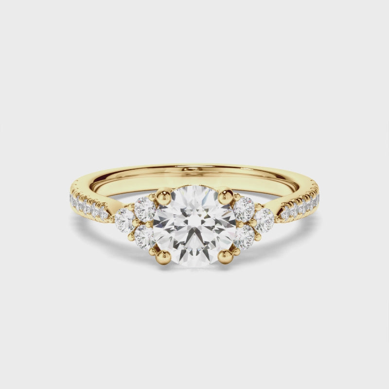 This timeless custom-made round brilliant cut diamond engagement ring, made with your choice of diamond centre stone, features six diamond cluster side stones and a half band of pave diamonds. Exuding fluidity in its line work, and boasting an elegant silhouette, as with all the pieces in our Bespoke Collection, this piece is made especially for you.